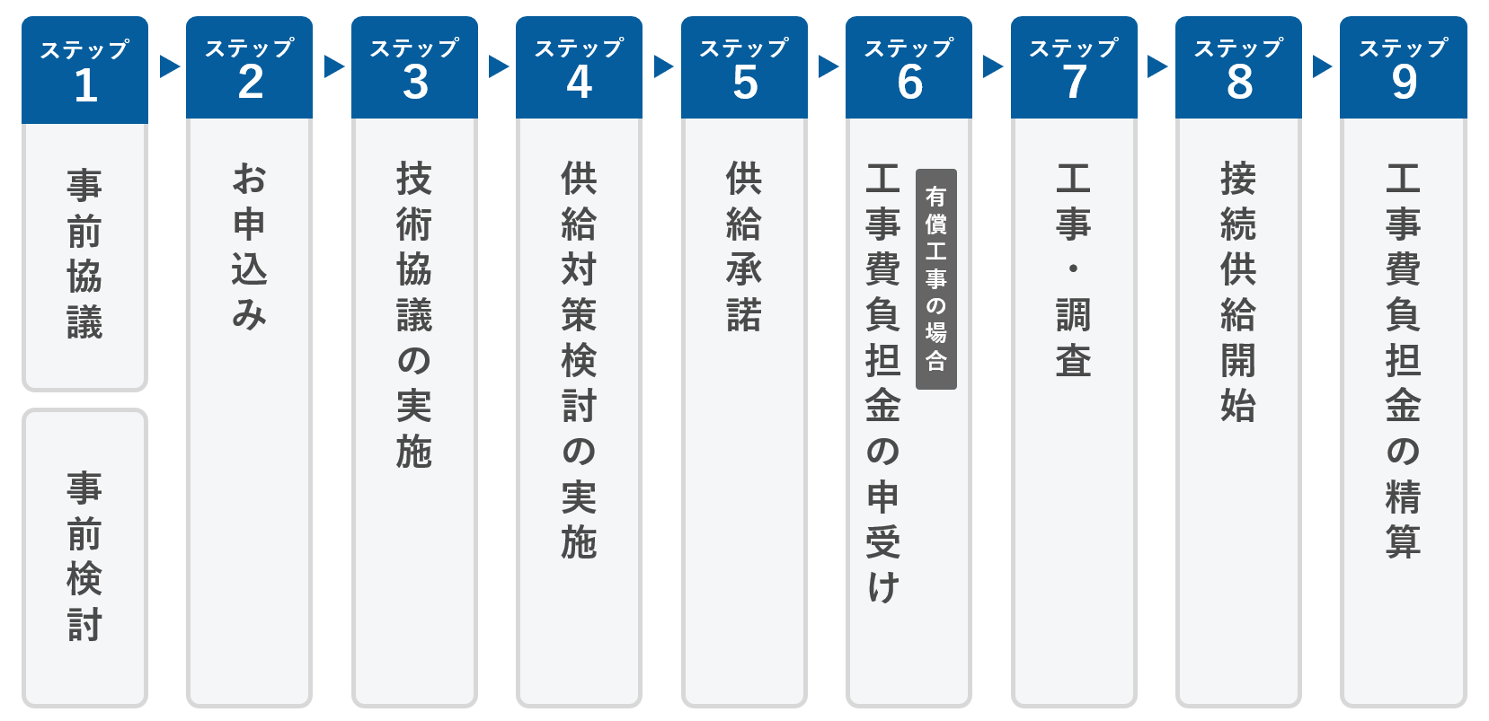 - 当社で供給設備の工事内容設計および用地交渉(必要な場合のみ)が完了次第、工事日の日程調整を行う。